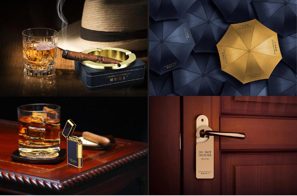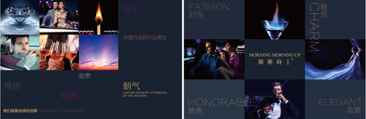不僅是對文字的重新設計,我們還對品牌的色彩進行提升。因為“朝朝向上”是一款面向中高端成功人士的養生酒,擁有洋酒的奢華尊貴的品質,所以我們選擇尊貴藍作為主色調,幽暗迷人的尊貴藍讓人聯想到優雅安靜的酒吧,尊貴的男士正細細品味這懂男人的酒——“朝朝向上”,彰顯尊貴、神秘、浪漫、魅惑的格調。
