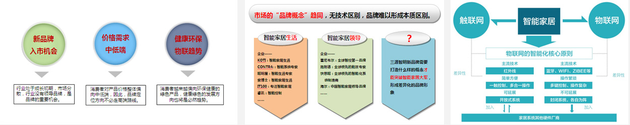 面對大型集團背景品牌聯合創新型互聯網企業,對“智能家居”概念的炒作占位,市場已經被強勢品牌“指鹿為馬”,消費者也已經認為這樣的產品才是智能家居。品牌若繼續單純訴求“智能家居”的概念將面對:一方面,落入競爭群中逐步被市場淹沒;另一方面,擁有技術差異化的三源智明,面對行業的以假亂真,會成為山寨版存在。