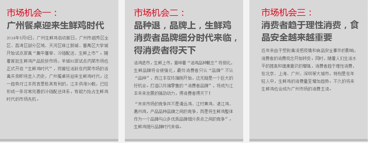 最后,從企業(yè)角度來說,江豐過去是以外銷為主導(dǎo),主要市場在香港,卻忽略了家門口的生意,所以在內(nèi)地肉雞終端市場的知名度很低,市場影響力小。此次廣州肉雞市場的改革,對江豐企業(yè)的轉(zhuǎn)型無疑是一次重大的市場機(jī)遇。本次策劃,CCBD中擂將以廣州市場為基點(diǎn),開啟江豐的品牌轉(zhuǎn)型之路,進(jìn)而輻射珠三角,直至覆蓋全國市場。
