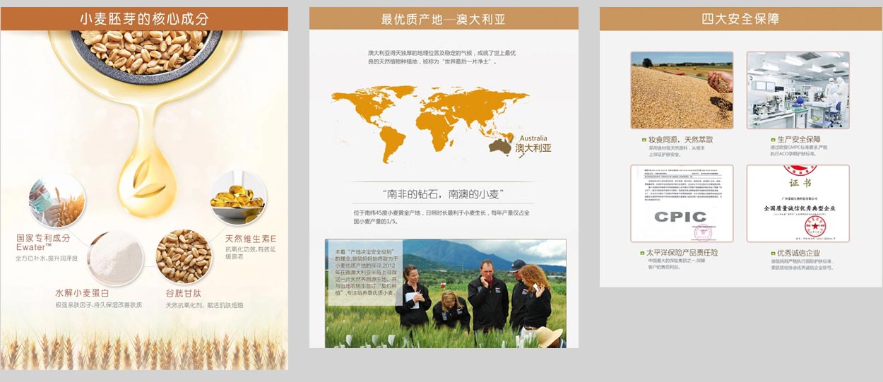 昆士蘭大學生物學專家Samuel,在野外調查項目中發現生活在小麥產區的小袋鼠成活率要比其他地區大。他對這個現象感到十分有趣,在其后多年的調查研究過程當中,他發現生活在小麥產區的袋鼠媽媽在懷孕的時候會摘吃小麥。于是對植被進行一系列的研究,進而發現小麥中含有大量葉酸等成分對胎兒的存活和成長都非常有益,而且小麥對孕期女性有補水保濕、防衰老、抗沮喪等功效,而小麥胚芽的功效比小麥更勝一籌。于是,孕婦專用護膚品“袋鼠媽媽”誕生了。