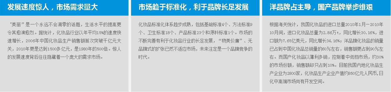 相關資料顯示,我國在逐漸發展成為化妝品消費大國,總體消費水平已超越歐盟、日本,僅次于美國,成為世界上化妝品第二消費大國,而且我國人口眾多,人均消費水平較低,還存在相當大的市場消費潛力,這無疑會給化妝品企業帶來很多發展機會。但是,擁有世界級市場的同時,我國也已經有了世界級的競爭,跨國公司紛紛進駐中國化妝品市場,將中國視為長期發展的最重要市場,以各種方式搶灘登陸。