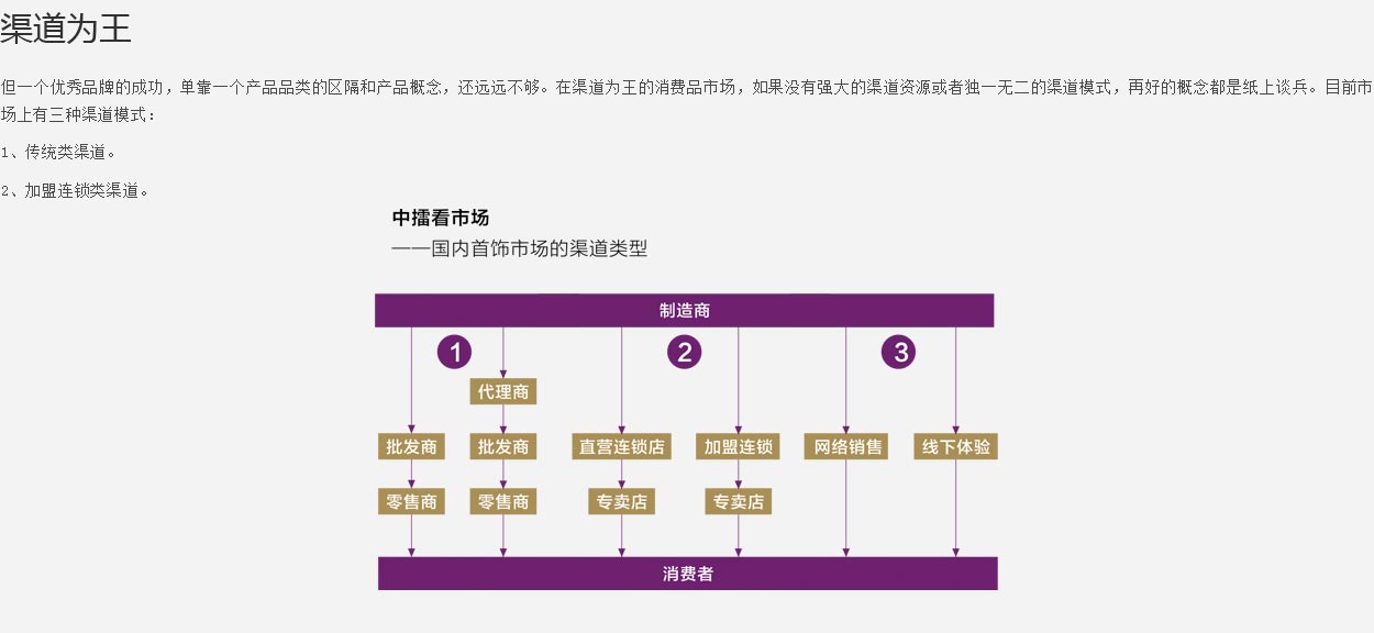 傳統(tǒng)類渠道的渠道長度過長,對于一個新起步的品牌,勢必要投入大量的人力物力拓展和開發(fā)管理渠道,在信息化的時代,對于一個流行時尚的產(chǎn)品品牌,也許還沒有等我們鋪好渠道,其他競爭對手已經(jīng)把我們拋在了身后;另外,由如果渠道成員的層級過多,勢必會分掉企業(yè)的大部分利潤,最終變成企業(yè)為渠道商打工。 加盟連鎖類渠道是目前首飾類產(chǎn)品的主流銷售渠道模式,其在經(jīng)歷了多年的運(yùn)作發(fā)展,已經(jīng)趨于成熟,但選擇連鎖加盟的方式在市場運(yùn)作初期的投入比較大,特別是對于一個新生的品牌,如何處理加盟商的信任問題,是每一個做連鎖企業(yè)最頭痛的問題,同時對于加盟商的培訓(xùn)管理也是一個難題。 最后一個是網(wǎng)購渠道。網(wǎng)購市場的興起已成為推動首飾市場發(fā)展的趨勢之一,網(wǎng)購作為一種新興的商業(yè)模式,已經(jīng)被越來越多的企業(yè)和消費(fèi)者認(rèn)可和接受,同時也有很多成功的企業(yè)家嘗到甜頭(如鉆石小鳥)。中擂因此認(rèn)為,卡曼芙作為一個新興品牌,走網(wǎng)購渠道,可以減少資本的投入,又能減低風(fēng)險,花小錢就能把渠道鋪向全國各地。
