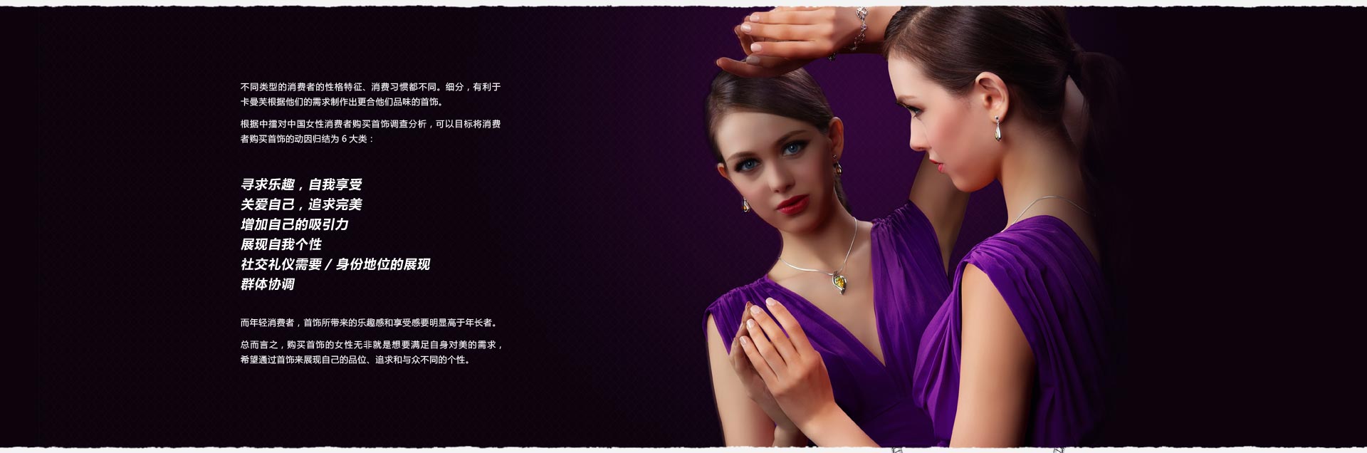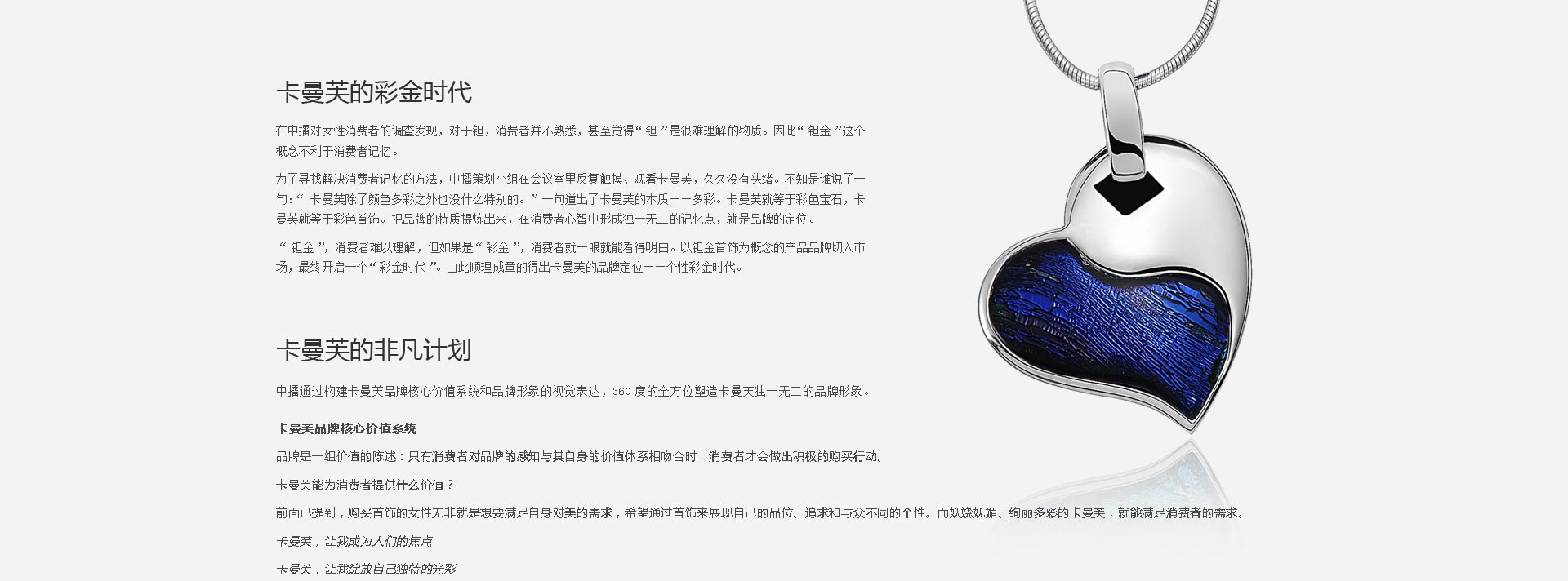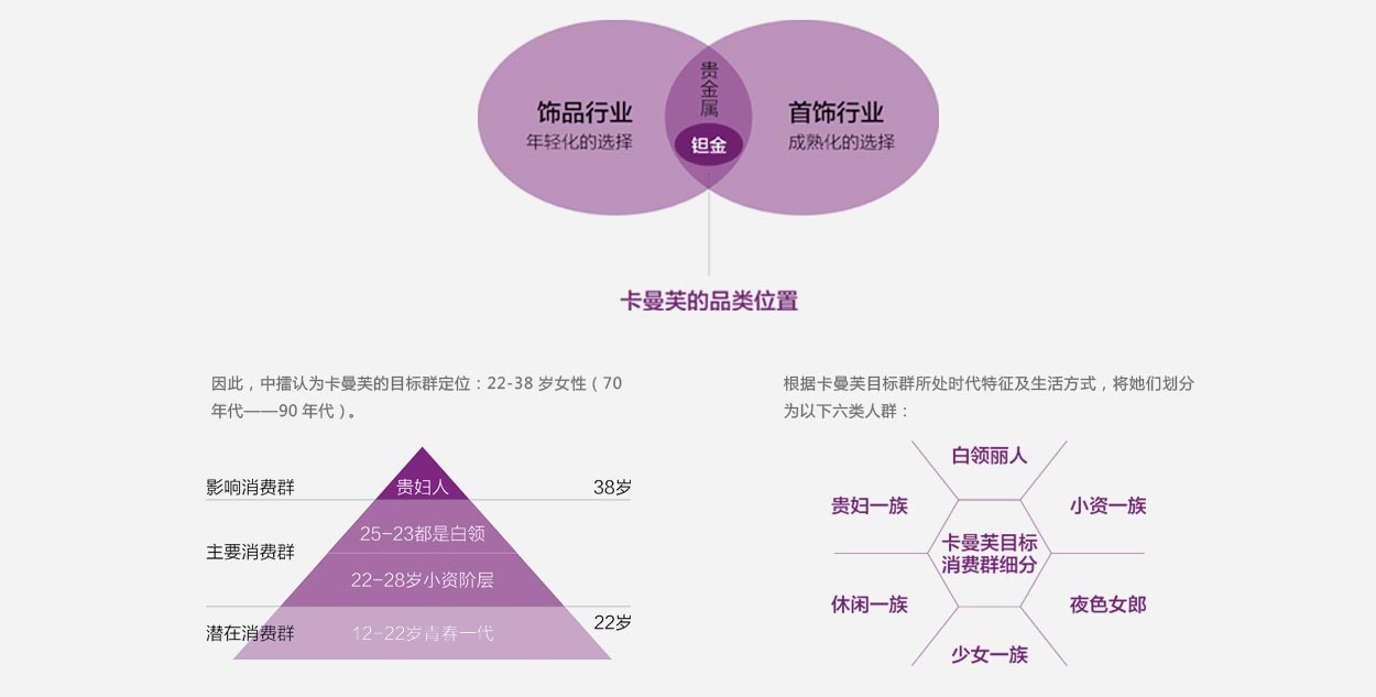 中擂通過對首飾市場的分析、目標(biāo)消費(fèi)人群的消費(fèi)特點(diǎn)分析,緊緊抓住目標(biāo)消費(fèi)人群的情感需求和功能需求,構(gòu)建卡曼芙品牌核心價值系統(tǒng)和品牌形象的視覺表達(dá),360度的全方位塑造與眾不同的卡曼芙彩金首飾品牌及其獨(dú)特的時尚文化,以網(wǎng)購渠道密碼開啟中國彩金首飾時代,并最終贏得國內(nèi)首飾中高端市場。