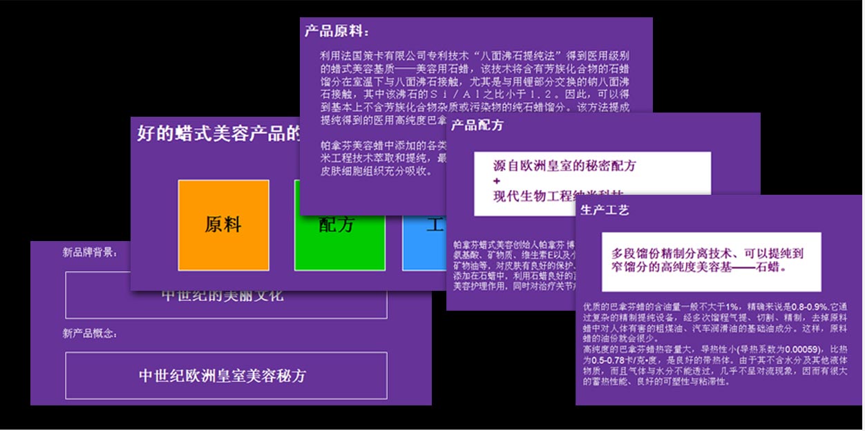 如何讓消費認為我們的蠟式美容產品就是全球最好的產品呢?原材料、配方和生產工藝是產品品質的三大基本保障,如何從這三個點進行公關與說明呢?這還需要中擂進一步的闡述。