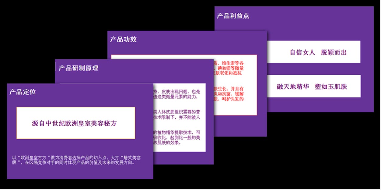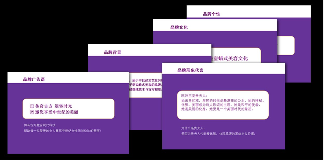 通過上面的分析我們基本是可以確定品牌將要走的方向:以中世紀的美麗文化為品牌背景,打古方秘制蠟式美容產品概念牌。