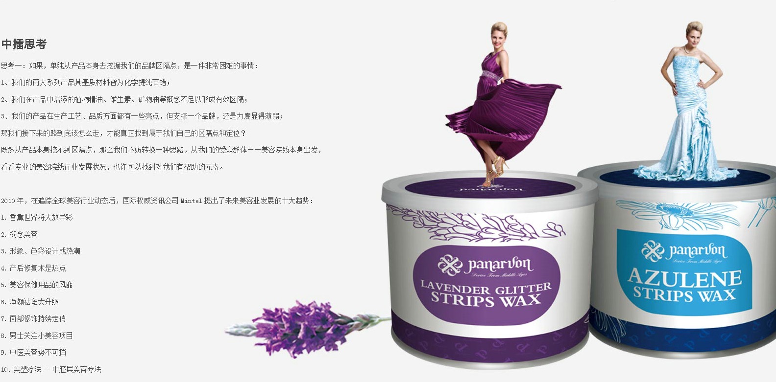 “概念美容”這張牌該怎么打?才能有效的區隔競爭品牌。打什么樣的概念,才能讓我們以一個鮮明的形象出現在消費者的視線。讓我們再回到原點,了解一下目前市場上美容用蠟主流品牌的狀況。