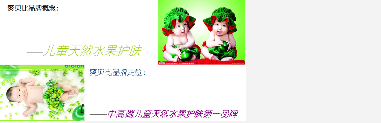 爽貝比以水果為主要原材料,提取水果素,水果精華,水果活性因子,用來兒童護(hù)膚,天然、健康、環(huán)保、安全,是一個好產(chǎn)品的重要體現(xiàn)!借水果部落故事片,以角色營銷為切入口,樹立水果護(hù)膚新理念。創(chuàng)造一個水果護(hù)膚部落,塑造一系列水果寶貝,形成一系列水果護(hù)膚故事。全面貫徹天然水果護(hù)膚理念。