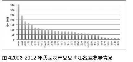 品牌知名度是潛在消費者認識或記起某一品牌某類產品的能力。品牌知名度的高低,反映消費者了解并認可該品牌及其產品的程度,從而反映出該品牌的市場競爭力。我國農產品馳名商標數由2008年的27件增長到了2012年的274件,其所占當年馳名商標總數的比例也由11.8%增長到了21.1%。這表明,隨著我國農產品品牌建設的加快,我國農產品品牌的知名度也在日益提升。